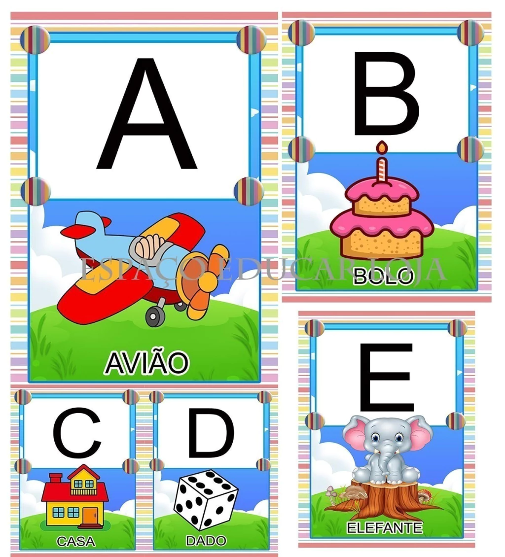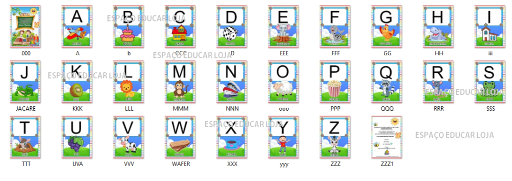 Cada cartaz traz uma linda ilustração do a até o z, com a escrita do nome da figura