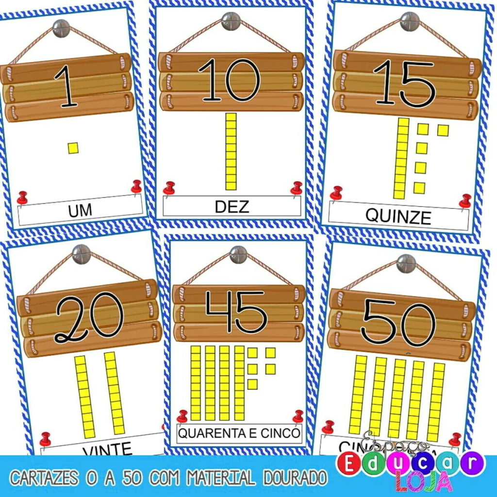 Um lindo conjunto, com os numerais de 0 até 50, representando as quantidades com material dourado e com os nomes dos numerais escritos por extenso em letra bastão.