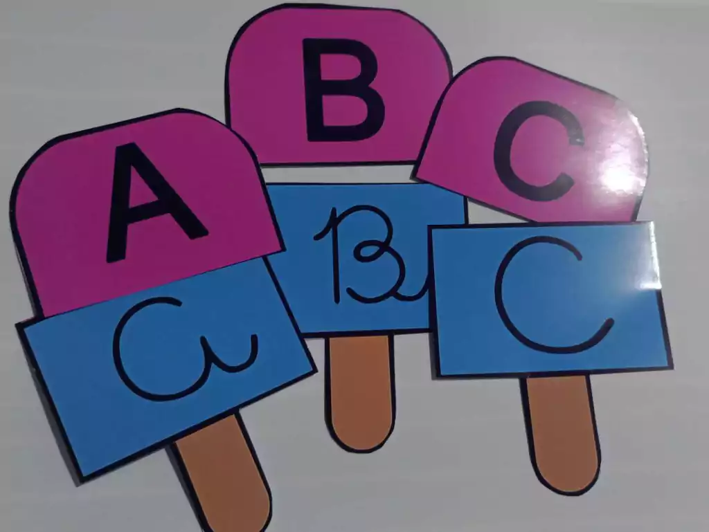São picolés contendo o alfabeto maiúsculo em letra bastão e em cursiva, para que eles façam a associação, aprendendo assim o traçado certinho das maiúsculas.